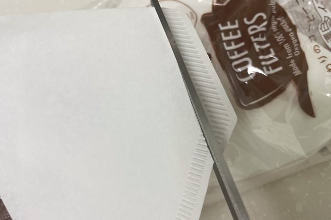 깔때기가 없거나 깔때기를 괜히 오염시키기 싫다면 커피필터를 활용해 보세요. 커피필터 끝 부분을 살짝 잘라주시고요