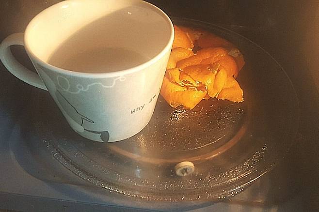 전자레인지도 사용하다 보면 불쾌한 냄새가 날 때가 있는데요. 이럴 때 귤껍질을 넣어주시고요. 물 약간 넣은 머그컵과 함께 3분 정도 돌려주세요.