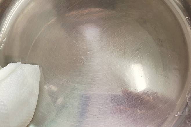 이럴 때 키친타월이나 물티슈에 식초를 적셔준 뒤 냄비에 덮어 딱 1분만 그대로 두세요.