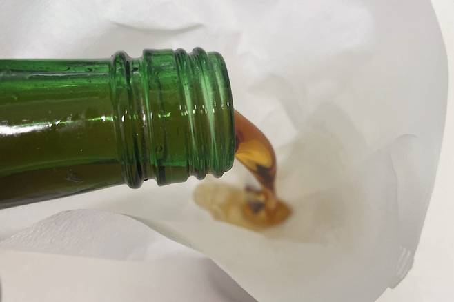 병에 끼운 뒤 참기름 같은 기름류를 부어주세요. 흘리지 않게 깔끔하게 옮길 수 있고요. 다 옮긴 뒤 그대로 쓰레기통에 버리면 되니 설거지가 따로 필요 없어 편합니다.