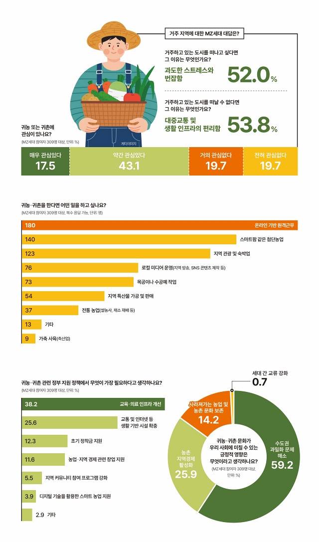 한 달 생활비의 절반이 넘는 집세, 매일 아침 출근길 ‘지옥철’에 시달리다 보면 도시 생활이 버겁다고 느껴지기도 해요. 그래서인지 최근에는 TV 예능 프로그램 ‘삼시세끼’처럼 연예인들이 농촌에서 직접 기른 채소로 요리해 먹는다거나 ‘촌캉스’처럼 농촌에서 휴가를 보내는 여행 콘셉트의 프로그램이 인기를 끌고 있어요. 실제로 농림축산식품부에 따르면 귀농 인구 중 청년이 차지하는 비중이 처음으로 10%를 넘어섰다고 해요. MZ 맞춤형 경제 콘텐츠 뉴스레터 '어피티'가 머니레터 구독자 309명 대상으로 MZ세대는 실제로 귀농·귀촌에 대해 어떻게 생각하는지 알아봤어요. 자세한 내용은 정책주간지 'K-공감'에서 확인하세요.