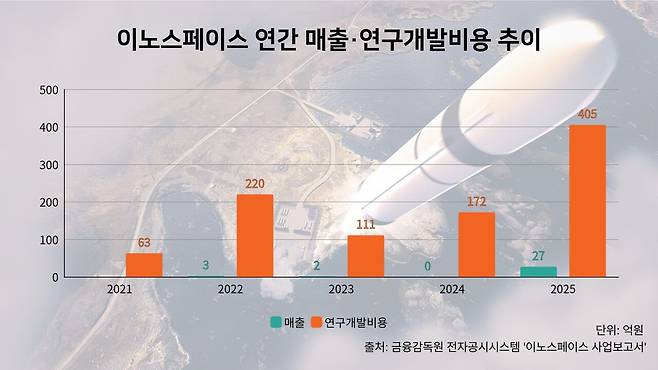 실제로 회사의 실적은 아직 부진한 상황이다. 이노스페이스의 지난해 매출은 27억원에 그친 반면 영업손실은 722억원, 당기순손실은 751억원을 기록했다. 동시에 연구개발비용은 430억원으로 매출 대비 1567%에 달했다. 연구개발과 발사 준비에 투입되는 비용 규모가 회사의 전체 매출을 크게 상회하고 있다.
