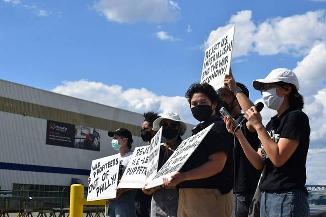이재명 대통령이 미국 필리조선소를 찾은 지난달 27일(현지시간) ‘자유로운사회주의조직(Freedom Road Socialist Organization, 이하 FRSO)’을 비롯한 다수의 사회주의 성향의 단체들은 조선소 정문 맞은편에서 조선업 투자 반대 집회를 열었다. 20여명 가량의 집회 참석자들은 “필리조선소는 국제 평화를 위협하는 군사시설”이라며 “한국과 미국이 손잡고 필리조선소를 다시 전쟁 생산 시설로 전환시켰다”고 비판의 목소리를 높였다.