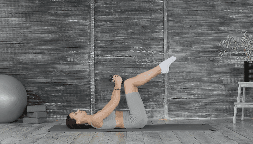 매트에 누워 양손에 아령을 들고, 다리를 공중으로 들어 무릎을 구부립니다. 손을 곧게 뻗은 상태에서, 머리 뒤로 내리며 동시에 왼쪽 다리를 앞으로 뻗습니다. 다시 시작 자세로 돌아와 이번에는 오른쪽 다리를 뻗으며 같은 동작을 반복합니다.