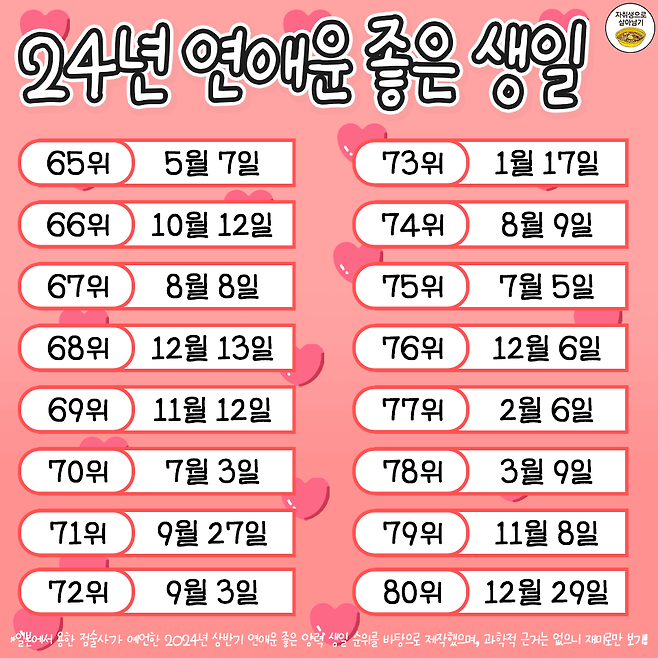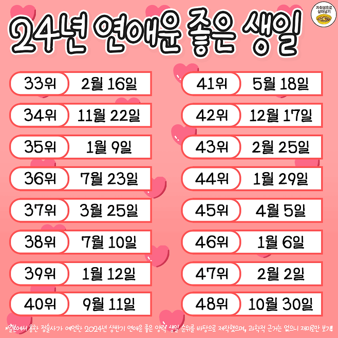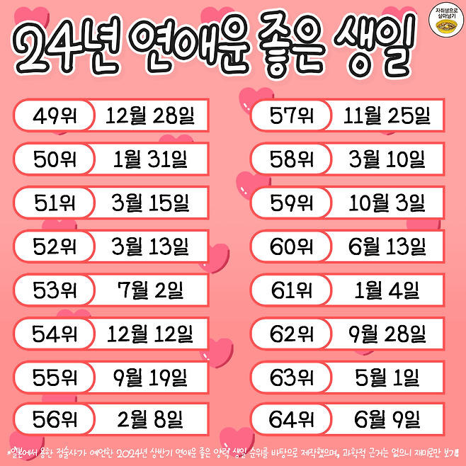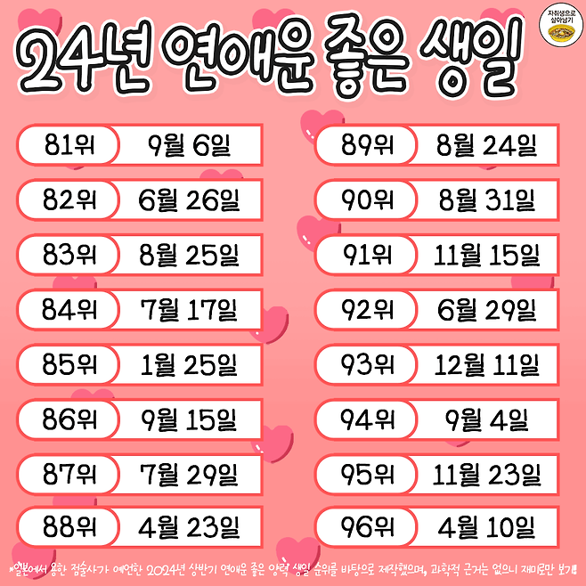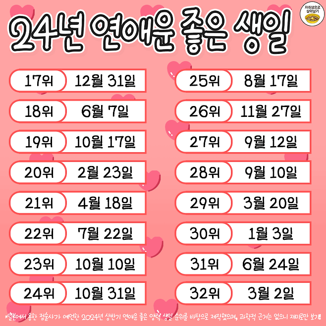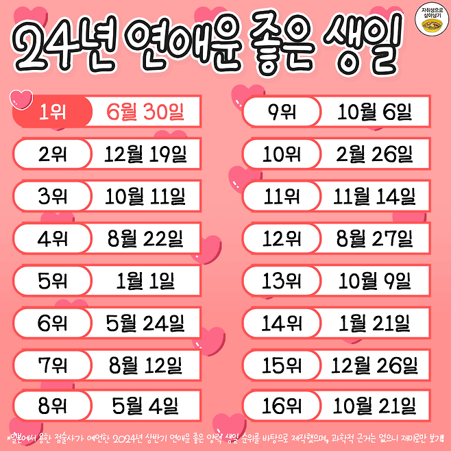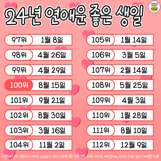 2024년 상반기에 연애운 좋다는 생일 TOP 100!