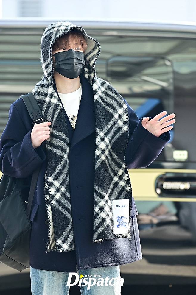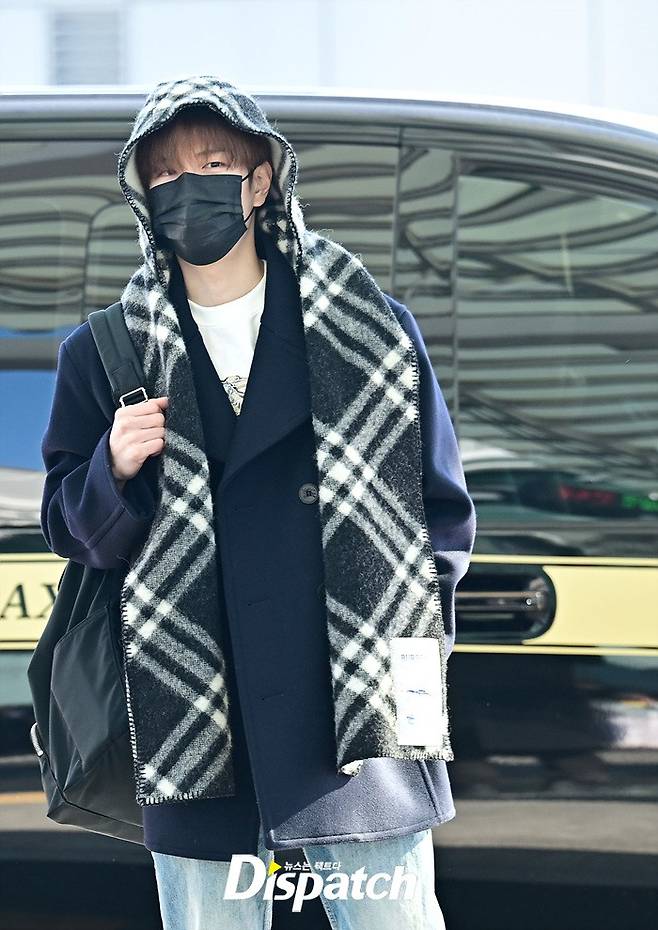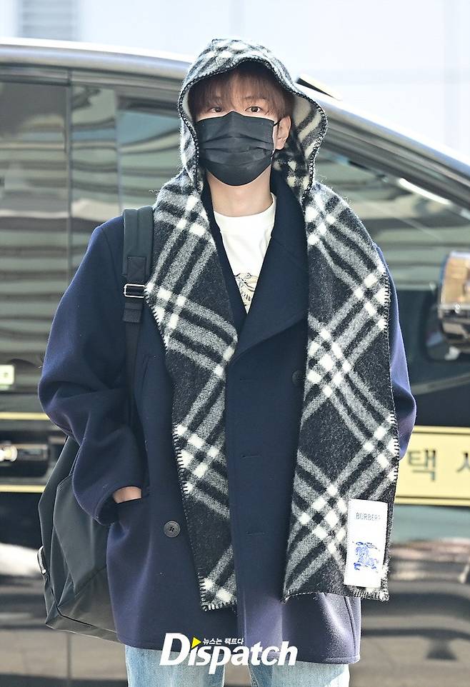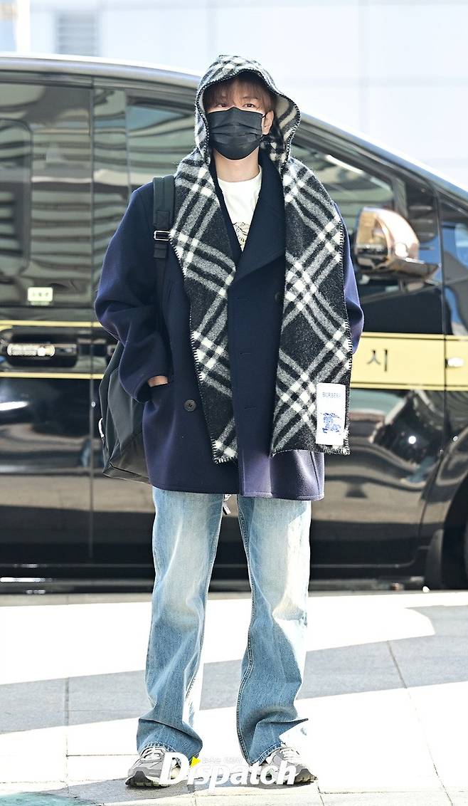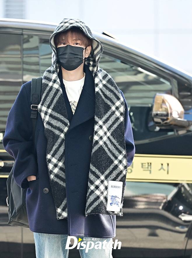 승민은 네이비 컬러의 코트와 데님진으로 댄디한 공항패션을 완성했다. 머플러로 연출한 센스있는 스타일링도 돋보였다.