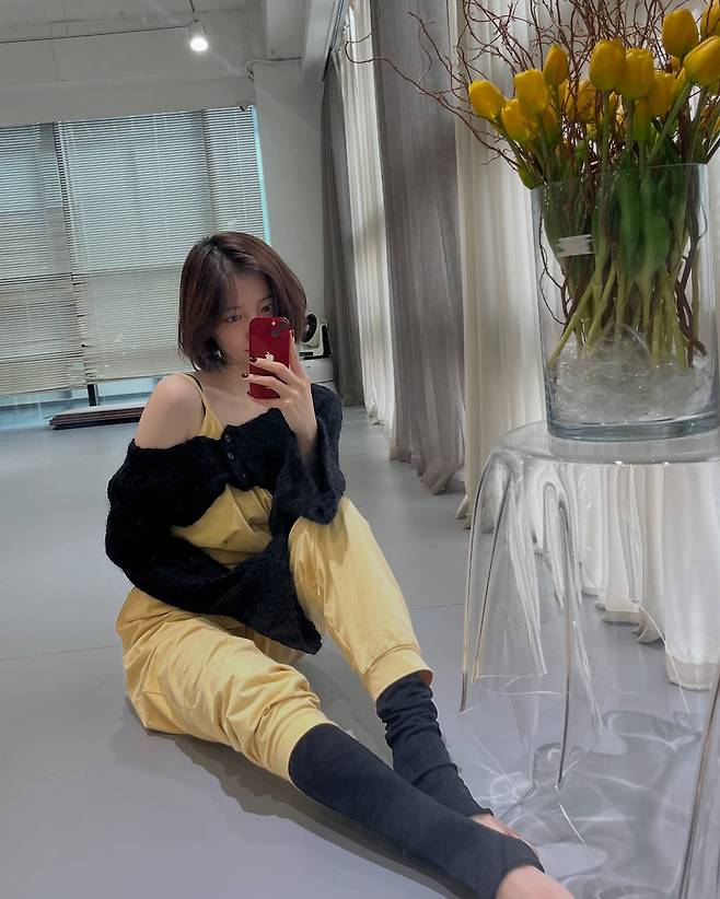 첫 번째 사진에서 박지현은 노란색 점프수트와 블랙 니트 가디건을 매치해 편안하면서도 세련된 실내 룩을 연출했다. 어깨를 살짝 드러낸 스타일링은 자연스러운 매력을 더하며, 블랙 레그 워머는 실내에서도 포인트를 주는 액세서리로 활용되었다. 옆의 노란 튤립 꽃병과 조화를 이루는 색감 선택이 돋보인다.