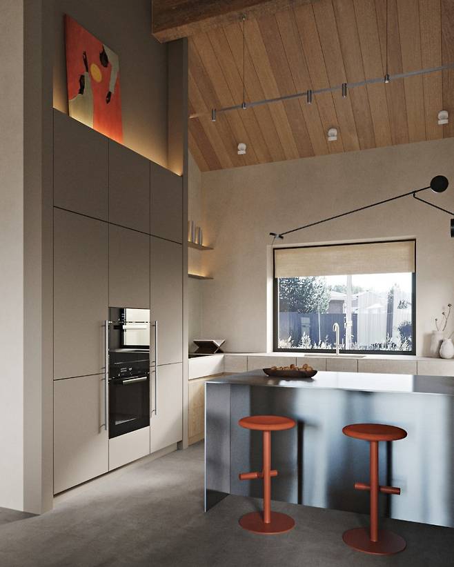 화려함 대신 절제를 택한 주방은 오히려 더욱 깊은 인상을 남긴다. 매립형 가전과 나무 장식장, 은은한 질감의 벽체가 조화를 이루며 차분하고 고급스러운 분위기를 연출한다. 중심에는 스테인리스 스틸 아일랜드와 테라코타 바 스툴이 배치되어 단조롭지 않으면서도 실용성을 갖췄다.