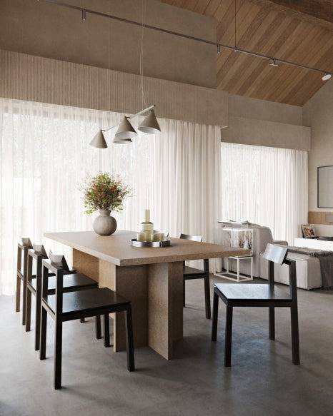 다이닝 공간은 가족과 지인이 모이는 장소인 만큼 온기가 중요하다. 이 빌라에서는 코르크 소재의 테이블과 검은 의자가 만나 세련된 분위기를 연출했고, 세 개의 조각 조명은 자연광과 어우러져 작품 같은 무드를 완성했다. 조명 하나가 공간을 바꾼다는 말이 실감 나는 지점이다.