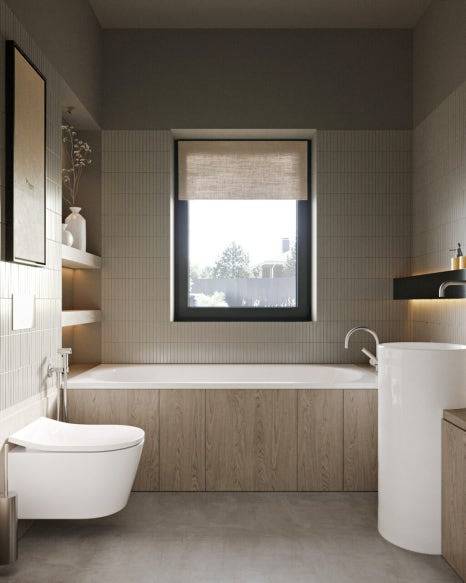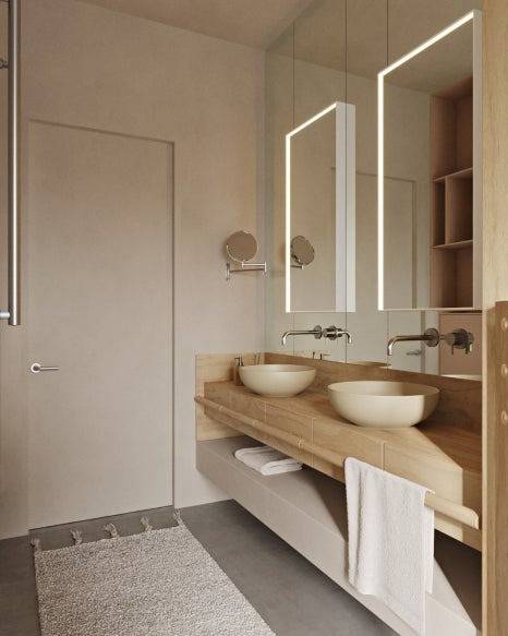 욕실 역시 단순한 기능에 머무르지 않았다. 원통형 세면대, 나무 악센트, 헤링본 타일 등으로 감각적인 분위기를 완성했으며, 다른 욕실은 세라믹과 스테인리스 소재를 활용해 자연스러움과 고급스러움을 동시에 담았다.