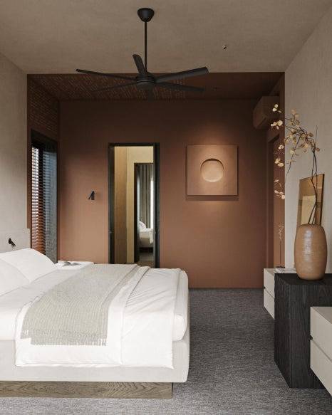 이 빌라의 침실은 불필요한 장식을 덜어낸 채, 휴식이라는 본질에 집중했다. 갈색 벽과 간결한 침대, 검은 조명이 만들어내는 조화는 마치 작은 호텔에 머무는 듯한 안정감을 준다. 침대 앞 벤치와 글로브 램프는 시각적인 밸런스를 맞추면서도 따뜻한 분위기를 더한다.