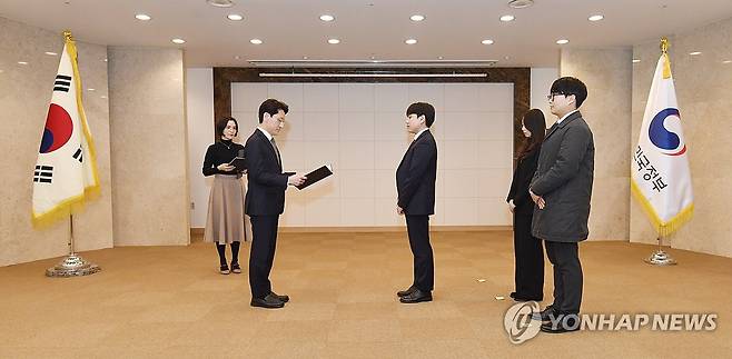(서울=연합뉴스) 김윤상 기획재정부 차관이 16일 오후 서울 종로구 정부서울청사에서 열린 '청년인턴 우수 공공기관 포상식'에 참석해 표창장을 수여하고 있다. 2024.2.16 [기획재정부 제공. 재판매 및 DB 금지]