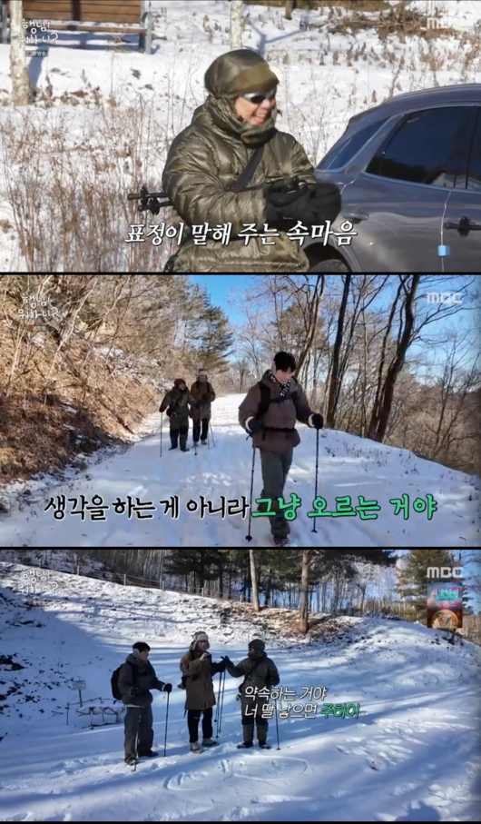 체감 온도는 무려 영하 24도. 그럼에도 세 사람은 아이젠을 끼고 스틱에 의지하며 등산을 했고 눈이 잔뜩 쌓인 숲길을 걸으며 우정을 더욱 돈독히 했다. 하하는 너무 추운 날씨 때문에 얼굴이 벌게졌지만 아랑곳하지 않았고 등산을 싫어하는 주우재는 이이경이 미안해 할까 봐 몸개그까지 펼쳤다.