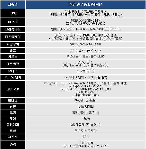 MSI 씬 A15 B7VF-R7은 AMD 라이젠 7 7735HS 프로세서와 엔비디아 지포스 RTX 4060 노트북 GPU를 통해 누구나 부담없이 게이밍 라이프를 즐길 수 있는 가성비 모델이다.