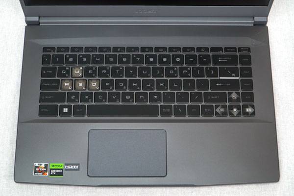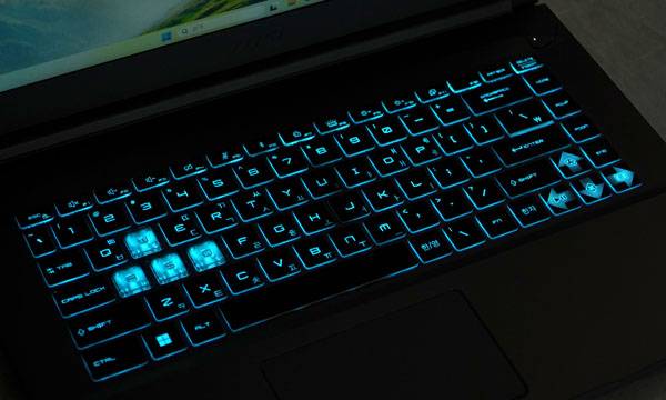 MSI 씬 A15 B7VF-R7 키보드는 1.3mm 키 트래블로 가볍고 쾌적한 타이핑을 제공하며, 화려한 RGB 컬러보다 실속있는 블루 LED 백라이트를 사용하여 사이버틱한 느낌을 내는 동시에 어두운 곳에서도 쉽게 키를 구분할 수 있다. 특히 게임에서 많이 쓰는 W/A/S/D 키캡을 반투명 처리하고 방향키를 강조한 것이 눈에 띈다.