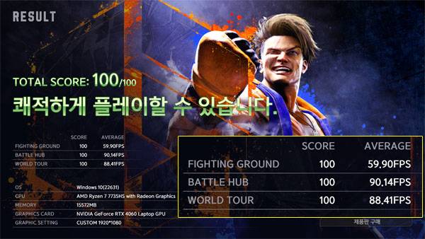 발열과 소비전력을 세밀하게 관리해야 하는 슬림 디자인으로 게이밍 노트북을 구현하기 위해 GPU 파워를 낮췄지만 RTX 4060 노트북 GPU의 게임 성능은 여전히 건재하다. 캡콤의 인기 대전 격투 게임 스트리트 파이터6 (STREET FIGHTER 6)를 돌리기에 충분한 시스템인지를 측정하는 벤치마크에서는 FHD 해상도에서 쾌적한 플레이가 가능한 것으로 나타났다.