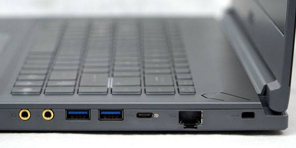 우측에는 별도로 구분된 3.5mm 헤드폰 단자와 마이크 단자, USB 3.2 Gen1 Type-A 포트 2개, USB-PD 충전 및 DP(DisplayPort) 출력이 가능한 USB 3.2 Gen2 Type-C 포트 1개, RJ45 기가비트 유선 랜 포트, 그리고 노트북 도난 방지를 위한 켄싱턴 락(Kensington Lock) 슬롯이 제공된다.