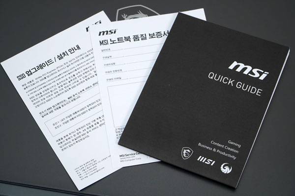 그 밖에 빠른 시작 가이드, 품질 보증서, SSD 업그레이드/설치 안내서 등이 포함된다.