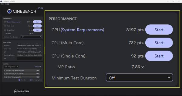 CineBench 2024 테스트 결과 싱글 코어 점수는 92점, 멀티코어 점수는 722점을 기록했으며, 2024버전부터 다시 포함된 GPU 테스트 점수는 8197점으로 TGP가 높게 설정된 고성능 게이밍 노트북보다는 낮은 점수를 기록했다.