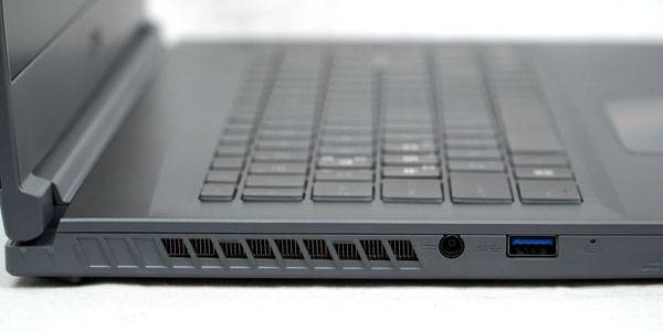 입출력 포트 구성을 살펴보면 최대 8K/30Hz 또는 4K/120Hz 출력이 가능한 HDMI 2.1 포트가 노트북 후면에 배치되어 있고, 좌측에는 통풍구 옆으로 외부 전원 어댑터 연결 단자와 USB 3.2 Gen1 Type-A 포트가 들어간다.