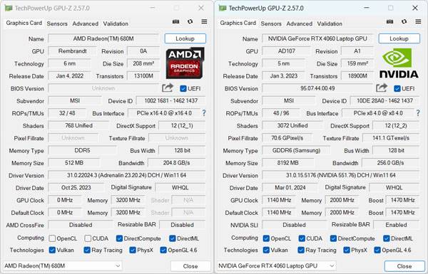 AMD 라이젠 7 7735HS에는 AMD 라데온 680M 그래픽 기능이 내장되어 있으나 게이밍 노트북답게 기본 그래픽 설정은 엔비디아 지포스 RTX 4060 노트북 GPU 8GB GDDR6로 되어 있다.