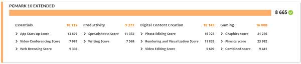 생산성 및 디지털 콘텐츠 제작, 게임 등 시스템 전반의 성능을 측정하는 PCMark 10 Extended 테스트 결과는 라이젠 7 7735HS 프로세서와 지포스 RTX 4060 노트북 GPU 조합으로 업무용 기기로도 좋은 성적을 낼 수 있음을 보여준다.