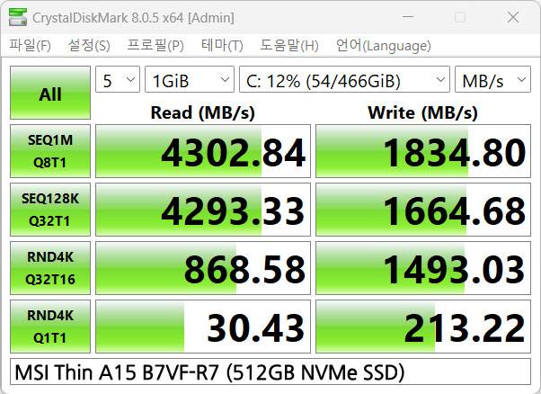 MSI 씬 A15 B7VF-R7에 들어간 512GB NVMe M.2 SSD는 CrystalDiskInfo에서 마이크론 2400 NVMe SSD가 사용된 것으로 나오는데, 보급형 PCIe Gen4 지원 PC 및 노트북을 타겟으로 176단 QLC 낸드와 PCIe Gen4, NVMe 1.4 인터페이스를 지원하는 모델이다.