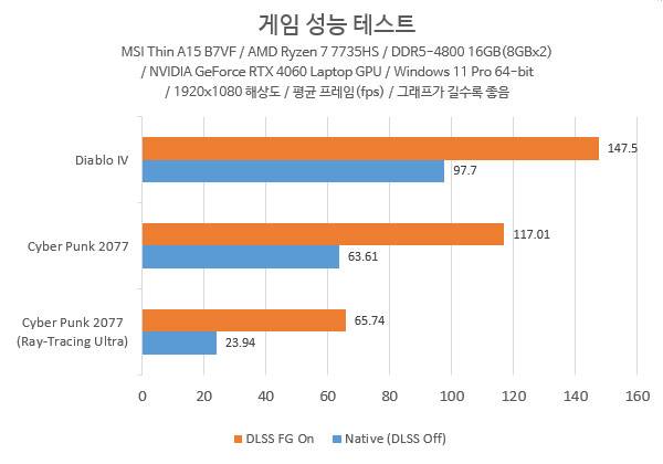 또한 지포스 RTX 40 시리즈가 지원하는 최신 DLSS 3 및 프레임 생성(Frame Generation, FG) 기술을 지원하는 게임은 더 높은 프레임으로 144Hz 재생률를 지원하는 MSI 씬 A15 B7VF-R7의 디스플레이가 제성능을 발휘할 수 있다.