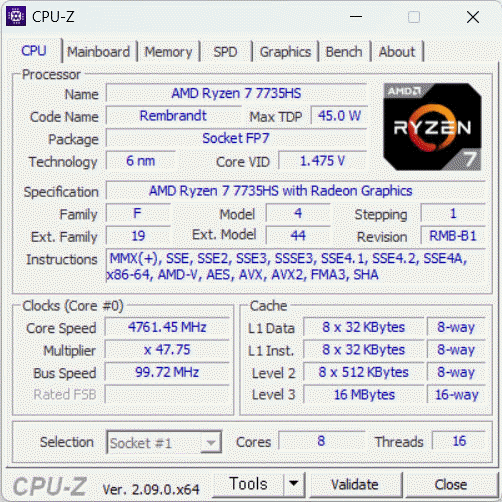 MSI 씬 A15 B7VF-R7에 탑재된 AMD 라이젠 7 7735HS 프로세서는 TSMC 6nm FinFET 공정으로 만들어진 6000 시리즈 렘브란트 리프레시에 해당한다. 8코어 16스레드 CPU 구성에 최대 4.75GHz의 부스트 클럭, 16MB L3 캐시가 들어가며, 기본 TDP 및 AMD Configurable TDP(cTDP)는 35-54W다.