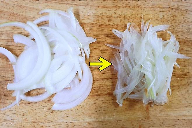 그러면 꼭 고깃집처럼, 샌드위치 전문점처럼 양파채가 아주 얇게 썰어진답니다.