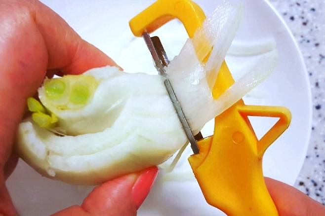 방법도 정말 간단한데요. 양파를 손에 쥐고 감자칼로 쓱쓱 밀어주기만 하시면 됩니다.