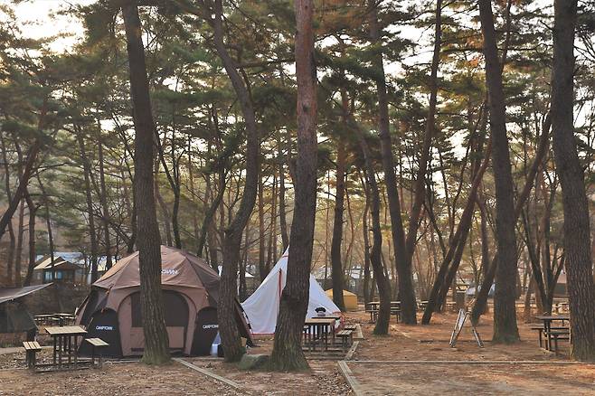반대편에는 1야영장 또는 A구역이라 부르는 자동차 야영장이 나온다. 여기엔 특별한 곳이 있다. 일명 탄소제로(0) 영지다. 신재생에너지를 이용한 구역으로 직접 전기자전거의 페달을 돌려 에너지를 생산해야 한다. 탄소 발생량이 없으므로 전기 사용료는 없다. 이곳을 이용하면 아이들과 자전거를 타며 운동과 야영은 물론 환경 교육도 하는 일석삼조의 시간을 보낼 수 있다. 입구에서 다리를 건너 들어가면 야영장 관리센터가 나온다. 그 뒤쪽 언덕을 오르면 풀옵션캠핑존2 구역이 나온다. 풀옵션캠핑존1 구역처럼 솔막들이 자리하고 있다. 다른 점은 계단식으로 돼 있어 오르락내리락해야 한다.
