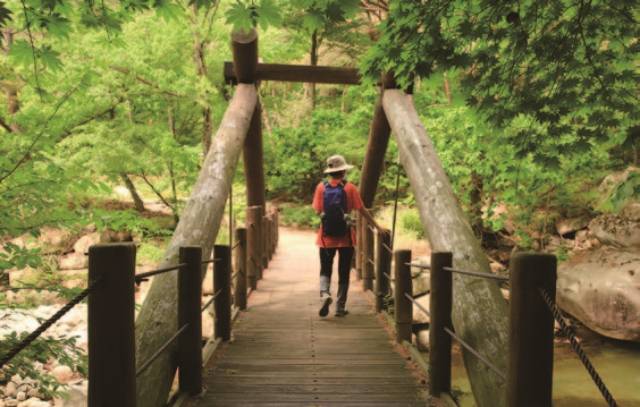다섯 냥 내고 넘던 험준한 고갯길을 걷다 보면 만수계곡을 만난다. 만수봉으로 가는 길목으로 걷기 좋은 자연관찰로가 있다. 만수교에서 1㎞ 남짓인 무장애 탐방로 구간도 있어 몸이 불편한 가족, 친구와도 동행할 수 있다. 휠체어를 타고도 만져볼 수 있는 계곡물 체험장이 인상적이다. 다리를 건너면 야생화 단지도 있다. 일제강점기 때 송유를 채취하던 가마도 있어서 아픈 역사도 짚어보고 간다.