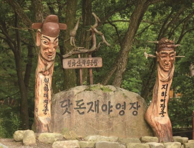 닷돈재4색야영장에는 소나무가 유난히 많다. 곧은 나무는 하나도 없다. 하나같이 개성적인 곡선의 몸짓을 보여준다. 야영장 입구 광장에는 작은 무대가 있고 월악산 마스코트인 산양 두 마리가 반겨준다. E구역 끝, 길 건너에 매점이 하나 있다. 그 앞을 지날 때는 닷돈재 터줏대감인 씩씩한 천하대장군, 지하여장군과 인사해야 한다.
