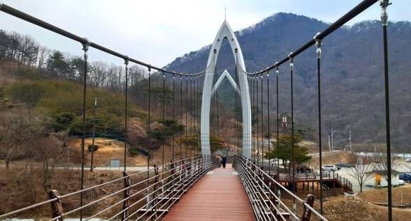 연하협 구름다리는 산막이옛길의 하이라이트 중 하나로, 길이 134m의 현수교 형식으로 만들어졌습니다. 다리를 건너며 느껴지는 짜릿한 스릴과 함께 괴산호의 절경을 한눈에 내려다볼 수 있어요. 특히 늦봄에는 푸르른 호수와 주변 산세가 어우러져 더욱 멋진 풍경을 제공합니다.