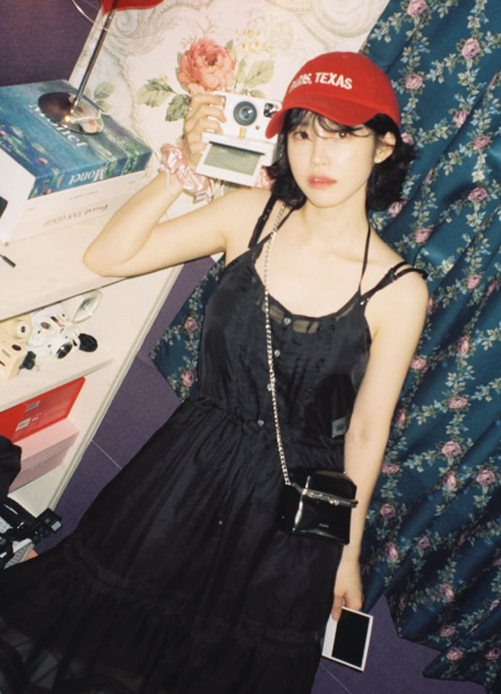 첫 번째 사진에서는 레드 캡과 블랙 슬립 원피스로 빈티지한 무드를 완성했고, 어깨에 길게 늘어진 미니 백이 포인트가 됐다.