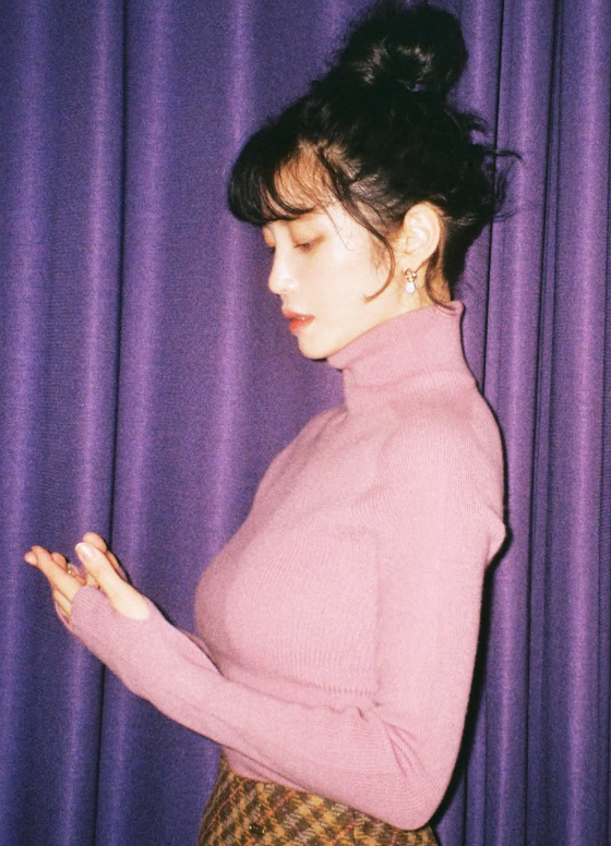 두 번째 사진에서는 핑크색 터틀넥 니트와 체크무늬 스커트로 고전적인 분위기를 연출하며, 보라색 커튼과 조화를 이루는 톤온톤 스타일링이 돋보인다.