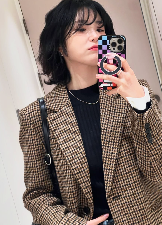 마지막 사진 속 전효성은 체크 패턴 재킷에 블랙 니트, 그리고 심플한 골드 네크리스를 매치해 데일리룩의 정석을 보여줬다.