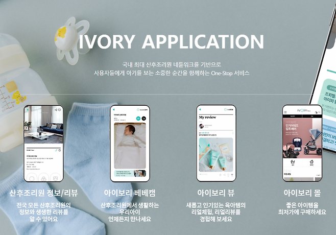 산후조리원 신생아 영상공유서비스 ‘베베캠’으로 서비스를 시작한 아이보리 앱엔 아이수첩 외에도 이미 다양한 편의 기능이 구비돼 있다. △육아 정보를 공유할 수 있는 ‘커뮤니티’ △라이브 쇼핑 ‘아라쇼’ △회원제 프리미엄 쇼핑몰 ‘아이보리 스토어’ 등의 서비스를 제공 중이다.
