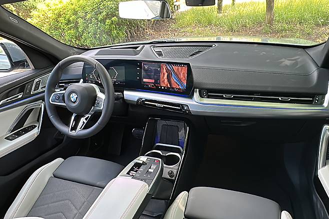 통상적인 센터 스택 대신 컨트롤 패널이 달린 플로팅 암레스트가 있다. 기어 실렉터와 볼륨, 마이 모드 등을 배치하고 있다. 여기에 실렉터 레버는 없다. 칼럼 시프트도 없지만 시프트 패들은 있다. 센터 스택 앞부분에는 2개의 컵 홀더와 간접 조명, 스마트폰 무선 충전기능이 추가됐다. 3스포크 스티어링 휠도 X1과 마찬가지의 구성이다.