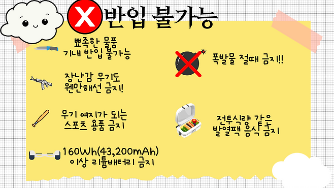 항공사마다, 또는 출발 국가/도착 국가의 규정에 따라 기내 반입 금지 물품에 대한 세부 사항이 다를 수 있습니다. 여행 전에 반드시 해당 항공사의 웹사이트나 고객센터를 통해 최신 정보를 확인하세요.