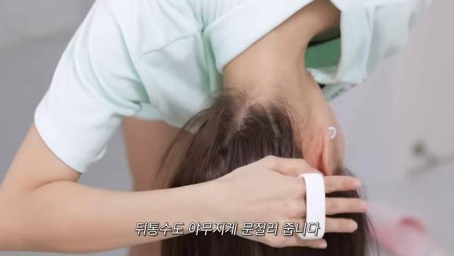 돌기가 촘촘한 괄사를 활용해 두피 마사지 역시 잊지 않는다. 위에서 아래로 내려가며 뒤통수까지 야무지게 문질러준다. 포인트는 측두근! 이곳을 집중적으로 마사지해 근육을 풀어주는데, 모근 강화는 물론이고 페이스 리프팅 효과까지 있다고 하니, 잊지 말고 충분히 마사지 해줄 것!