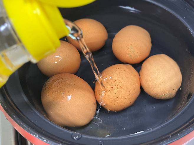 계란이 거의 잠길 정도로 물을 붓고, 식초 1스푼 넣으세요. 그럼 껍질이 잘 깨지지 않고, 삶은 후 껍질도 훨씬 매끄럽게 잘 벗겨집니다.