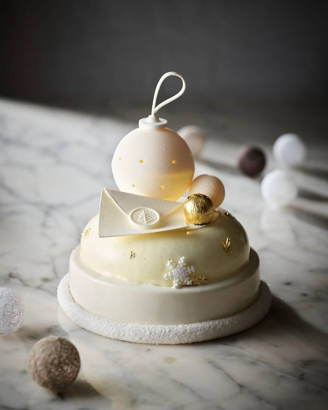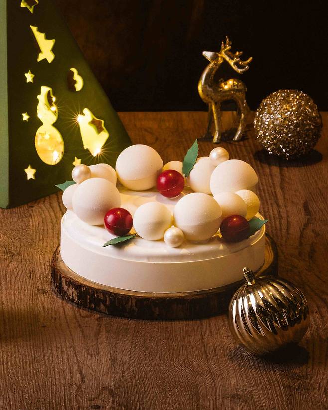 눈 덮인 화이트 크리스마스가 떠오르는 케이크다. 크고 작은 오너먼트 장식을 케이크 모퉁이에 리스 모양으로 둘러 연말 케이크로의 존재감을 알렸다. 케이크 안에는 망고 패션 콤포트를 두껍게 채워 케이크를 입안에 넣자마자 사르르 녹는 상큼함을 경험할 수 있다.