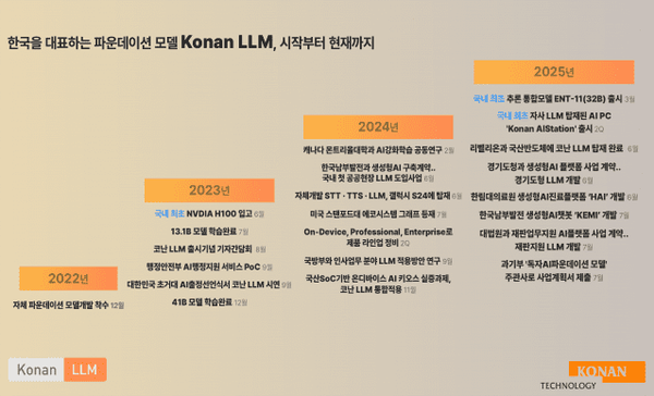 코난테크놀로지는 2023년 131억 파라미터 모델을 시작으로 410억 파라미터 모델과 온디바이스 경량 모델을 차례로 내놓으며 독자 LLM 개발을 이어왔다. 올해 3월에는 국내 최초로 범용과 추론 기능을 하나로 통합한 ‘ENT-11’을 출시했다.