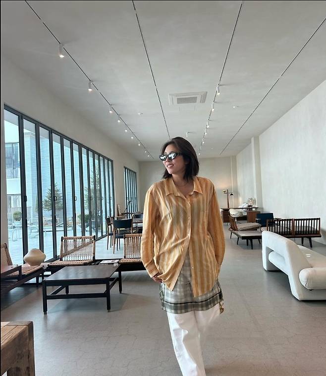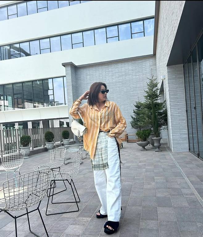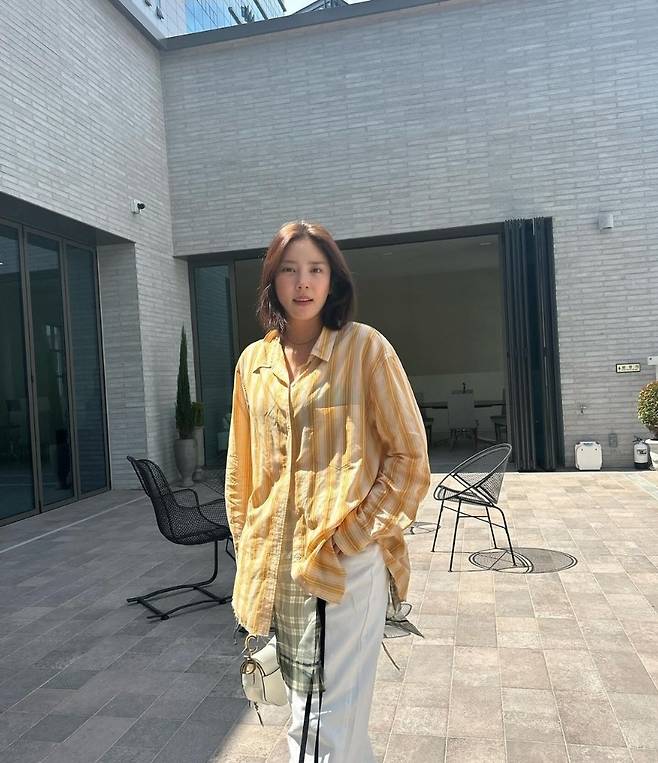 손담비는 노란색 스트라이프 셔츠를 착용해 스타일리시하고 활기찬 분위기를 자아냈습니다.