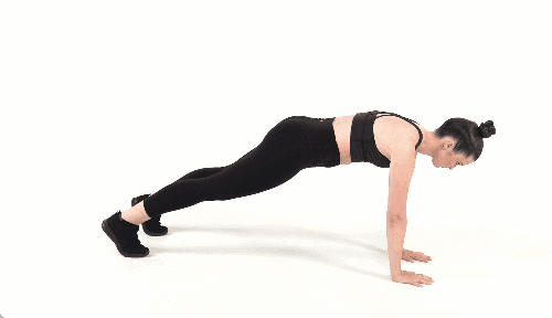 플랭크 자세를 만듭니다. 오른쪽 팔을 구부려 팔꿈치를 대고, 이어서 왼쪽 팔꿈치도 구부려 원래 팔꿈치 플랭크 자세를 만듭니다. 이번에는 오른쪽 팔꿈치를 펴서 손바닥을 짚고, 이어서 왼쪽 팔꿈치도 펴서 원래 자세로 돌아옵니다.