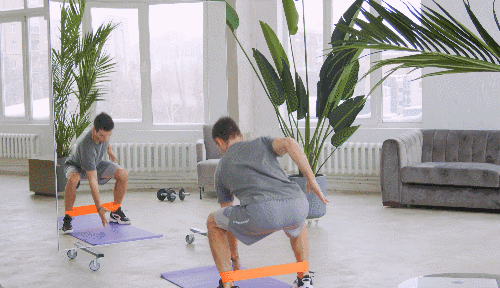 바닥에 서서 허벅지에 탄력 밴드를 착용합니다. 스쿼트 자세로 내려가면서 왼손으로 바닥을 터치합니다. 원래 자세로 올라오면서 점프하여 발을 모았다가, 다시 점프하며 발을 벌려 스쿼트 자세로 돌아옵니다. 이번에는 오른손으로 바닥을 터치하며 같은 동작을 반복합니다.