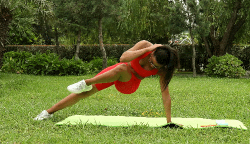 왼손으로 몸을 지탱하며 사이드 플랭크 자세를 만듭니다. 오른손은 머리 옆에 둡니다. 왼쪽 무릎을 당기면서 상체를 틀어 내려가 오른쪽 팔꿈치와 무릎이 가까워지도록 합니다. 이 동작을 반복한 후, 반대편으로 자세를 바꿔서 운동합니다.