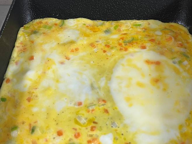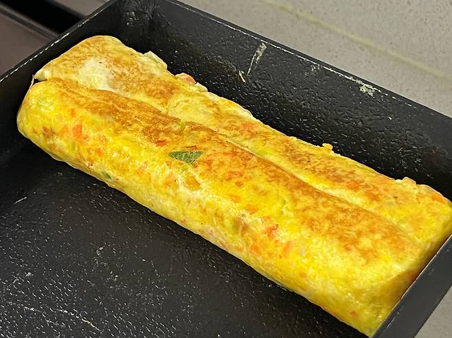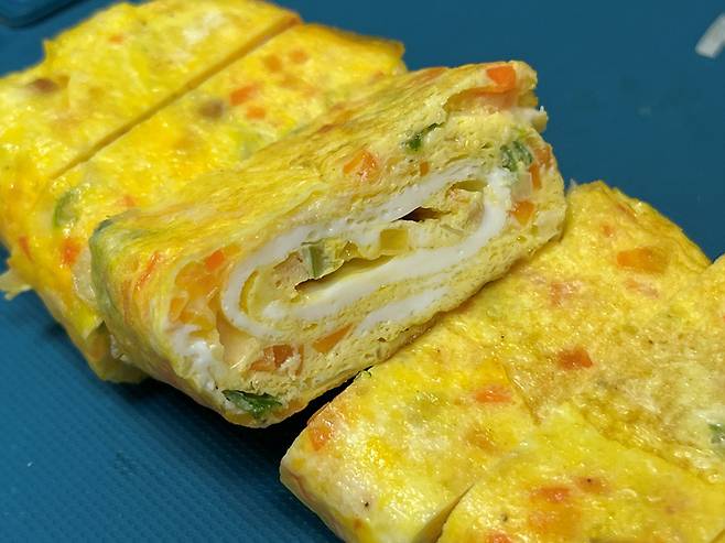 계란을 말고, 다시 계란물을 부어서 같은 과정을 반복합니다. 계란말이에 치즈를 넣어서 만들면 한층 더 고소하고 깊은 풍미를 느낄 수 있습니다.